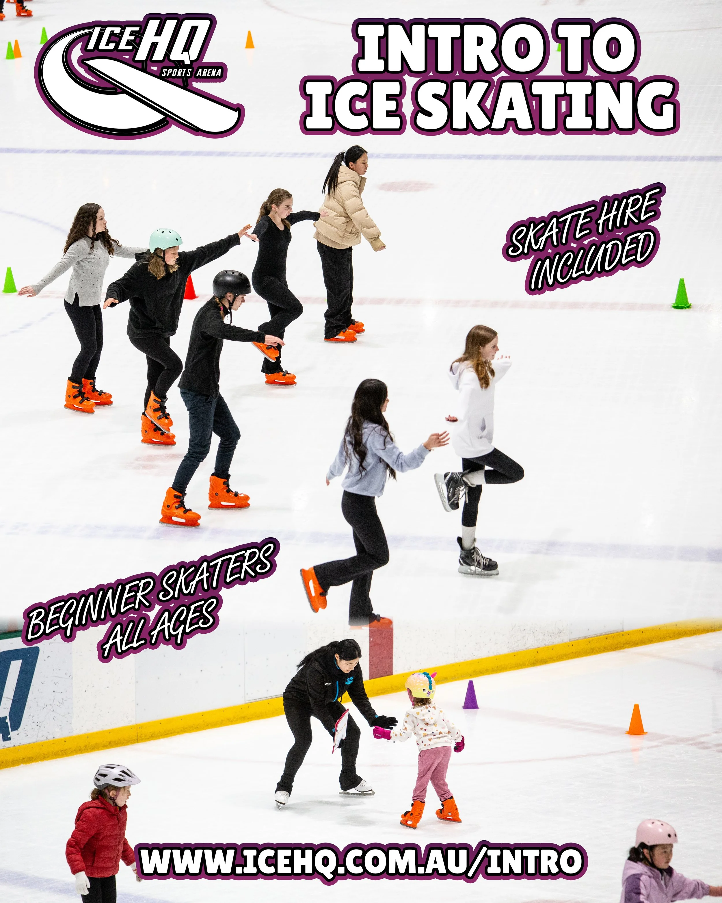 Skate hire and optional protective gear will be supplied for every registrant. Helmets must be worn for all introductory classes.